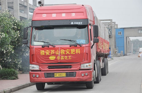 2013年5月28日上午9時(shí)30分,華昌化工一輛掛著“華昌化工攜手雅安抗震救災(zāi)”條幅,裝載著重達(dá)40噸“金字牌”復(fù)合肥的重型卡車緩緩從廠區(qū)駛出,兩天后,專車將經(jīng)過(guò)二千多公里的長(zhǎng)途跋涉,抵達(dá)四川雅安蘆山縣,將這批凝聚華昌全體員工愛(ài)心的復(fù)合肥送到災(zāi)區(qū)人民手中。